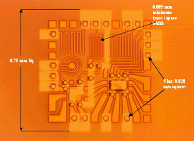 プリント基板の高密度化、微細化は定常的に進んでいますが、フレキシブル基板も例外ではありません。ディスプレイパネルのドライバモジュールのサブストレート用にはピッチ20μmの高密度フレキシブル基板が量産されていますし、特殊な医療用デバイスには10μmピッチの多層フレキシブル基板が使われています。層間を繋ぐビアホールの大きさは20μm未満です(図)。技術的には、5μmピッチで6層ぐらいまでの回路の製作が可能になっています。